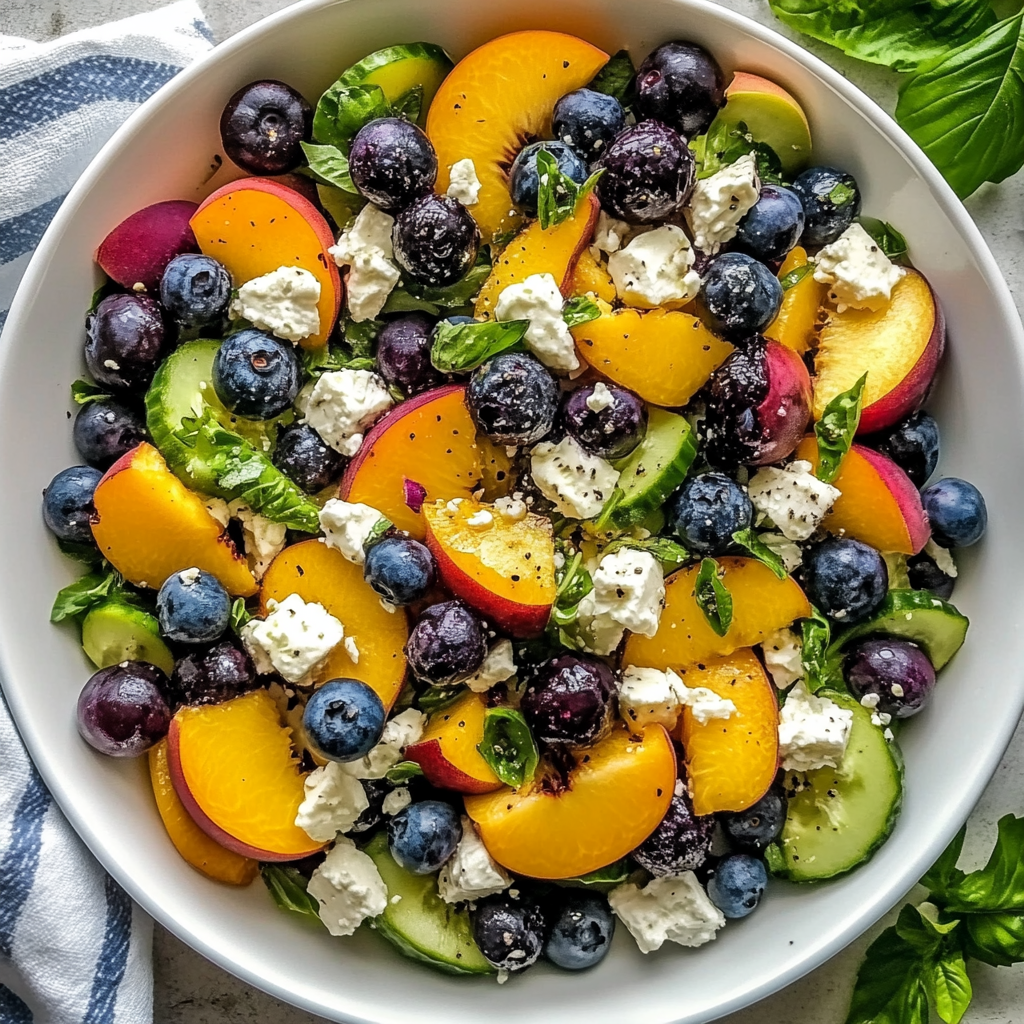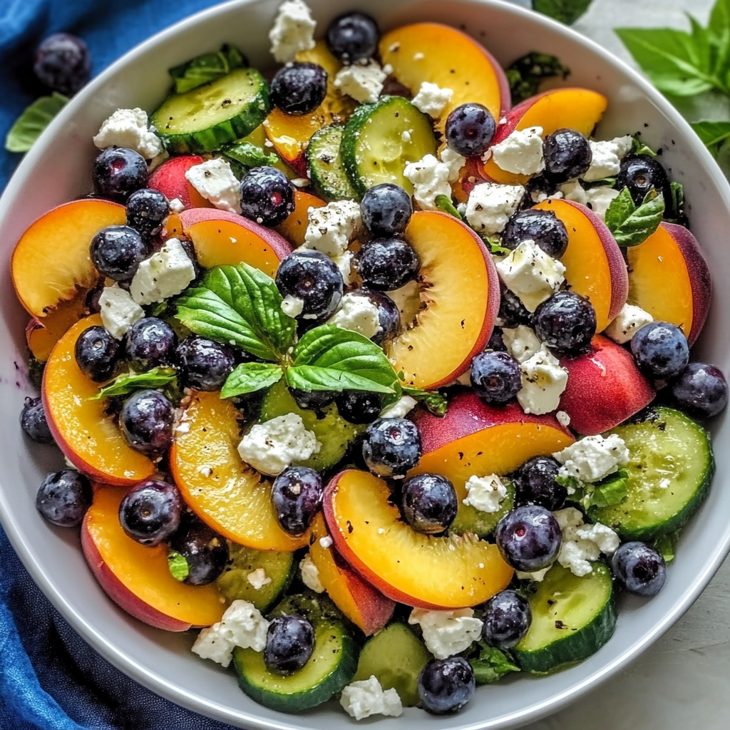 - In a large bowl, combine blueberries, diced peaches, sliced cucumbers, and crumbled feta.