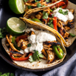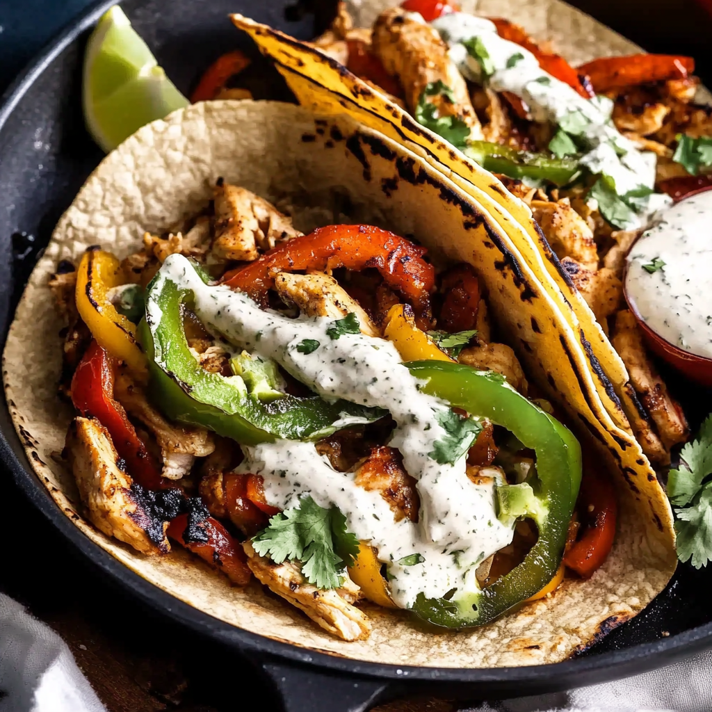 - Assemble fajitas by filling warmed tortillas with the chicken mixture and topping with creamy sauce.