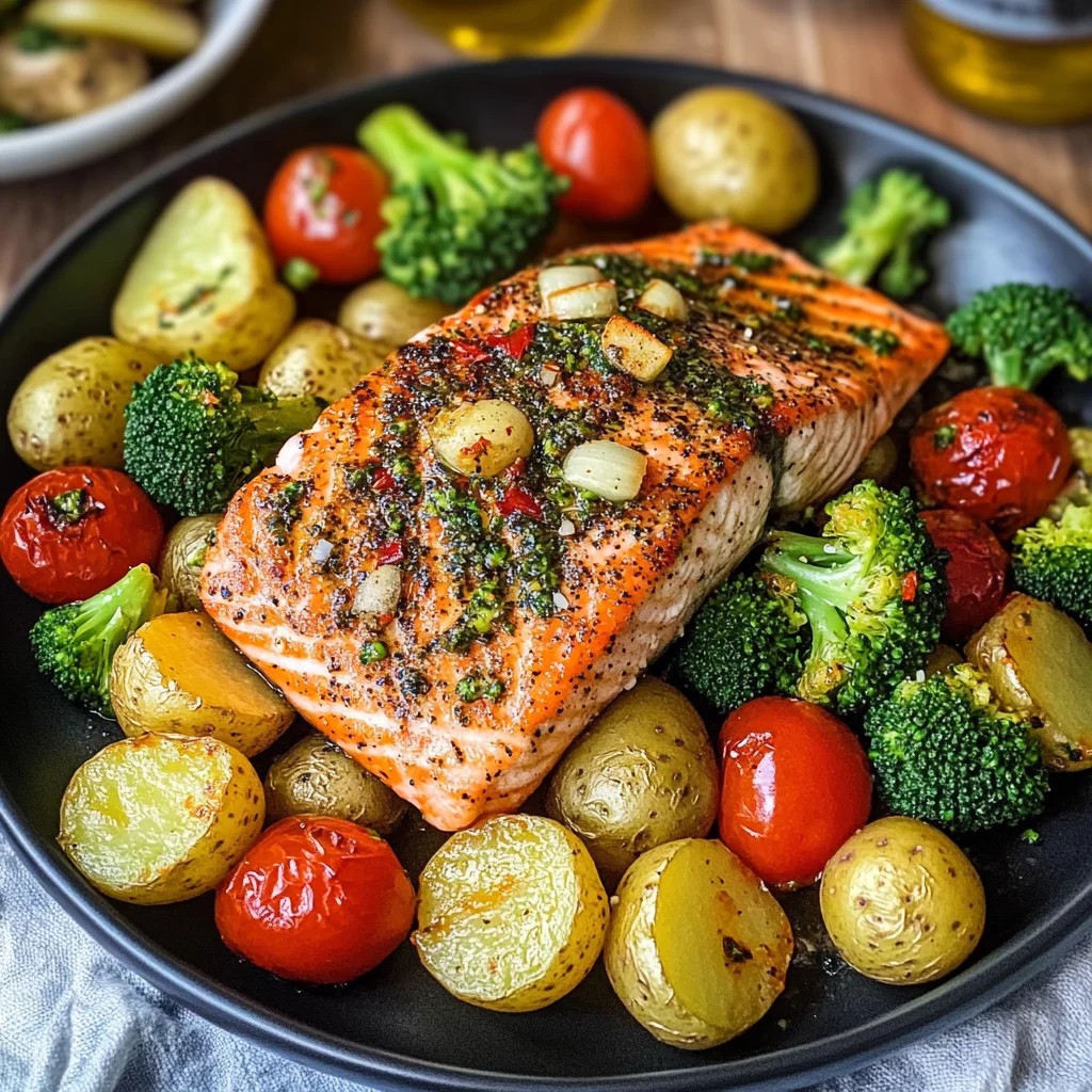 Za’atar Garlic Salmon is a delightful Mediterranean-inspired dish that brings vibrant flavors and wholesome ingredients together in just one pan. This recipe features succulent salmon fillets seasoned with aromatic za’atar spice and garlic, paired with a colorful medley of roasted vegetables. Perfect for busy weeknights or special gatherings, this meal is not only quick to prepare but also packed with nutrition. Each bite delivers a satisfying blend of textures and tastes, making it an instant favorite for both families and guests. With minimal cleanup required, you can spend more time enjoying the delicious results!